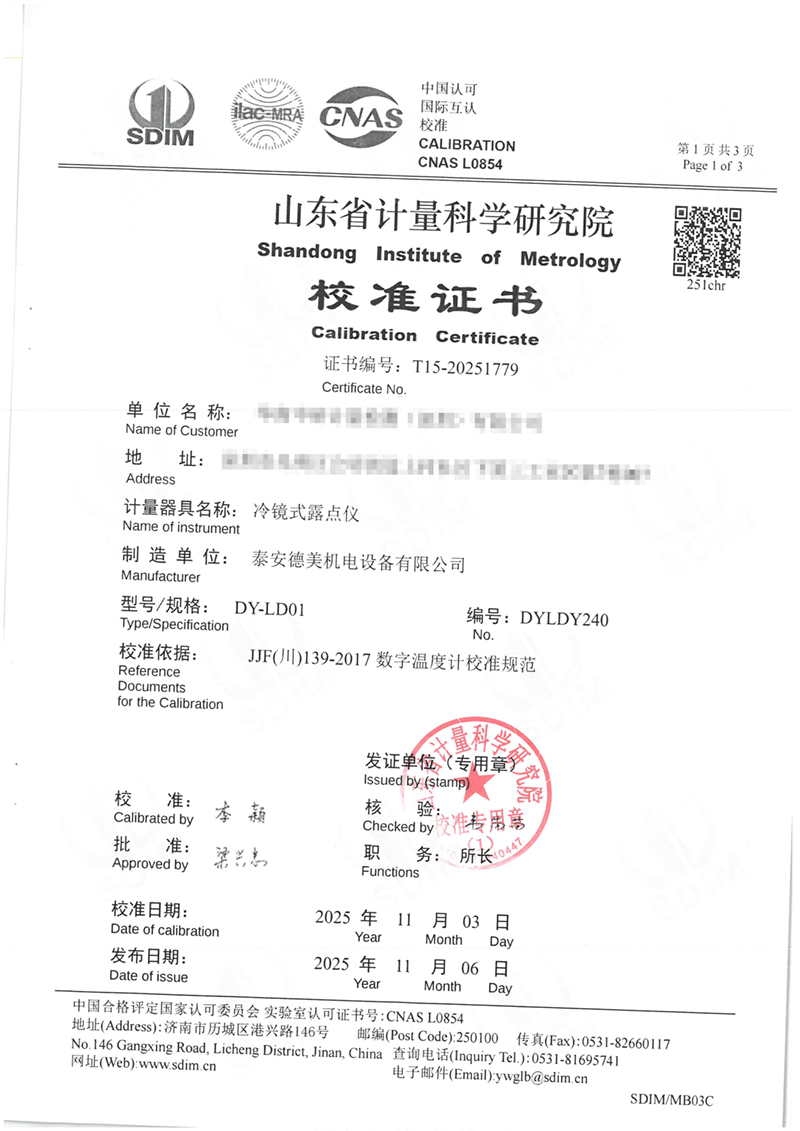 冷鏡式露點(diǎn)儀校準證書(shū) 2025-11-7 本文被閱讀 120 次