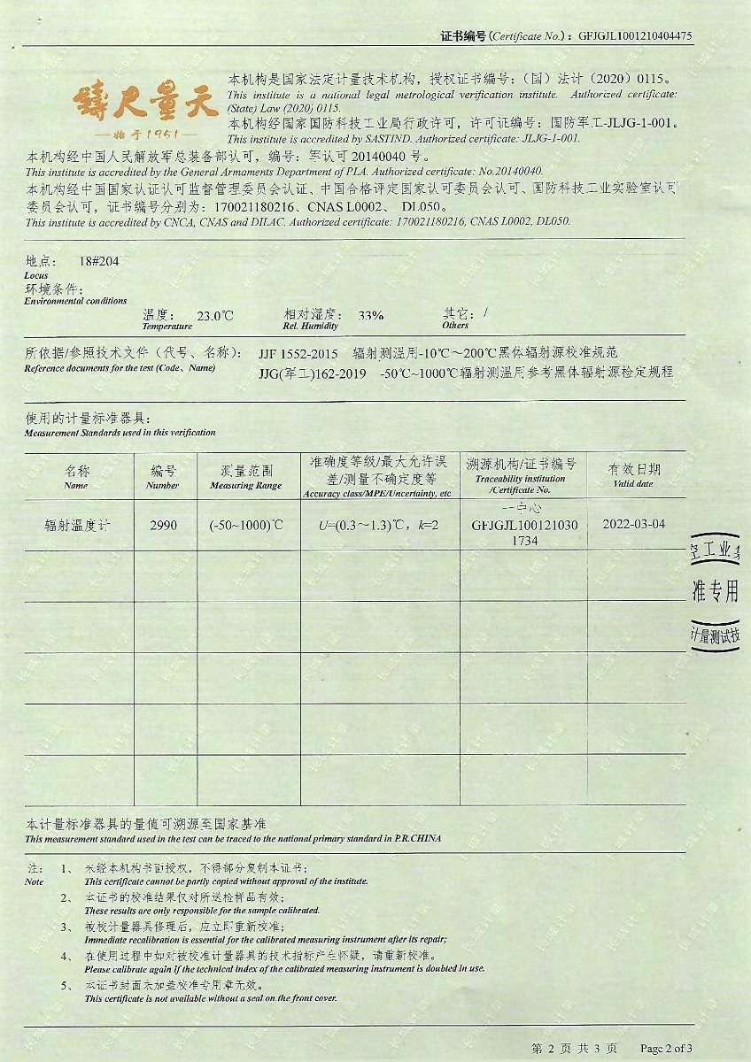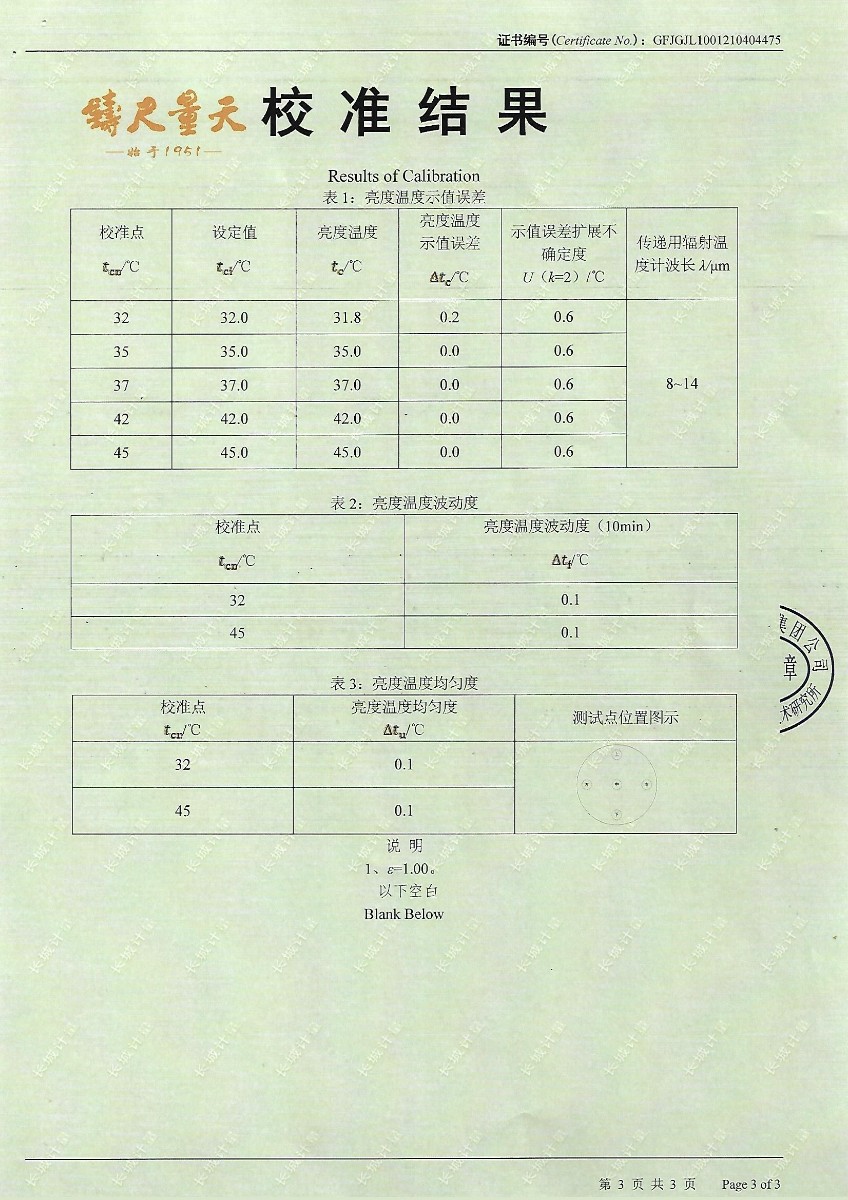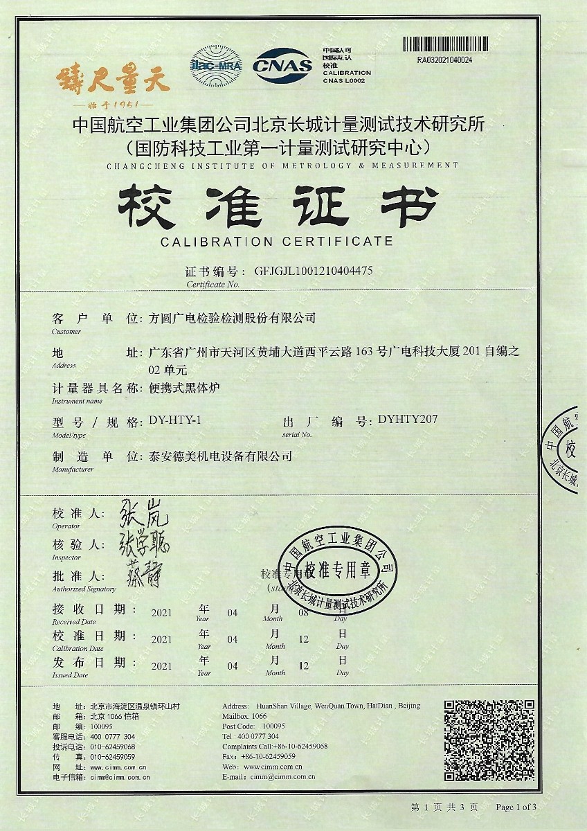 | 上一條:上海紅力檢測技術(shù)有限公司-耳溫計黑體空腔 | 下一條:便攜式干體爐(-30-150℃)校準證書(shū) |