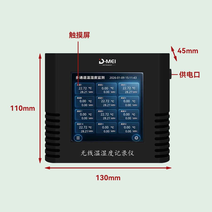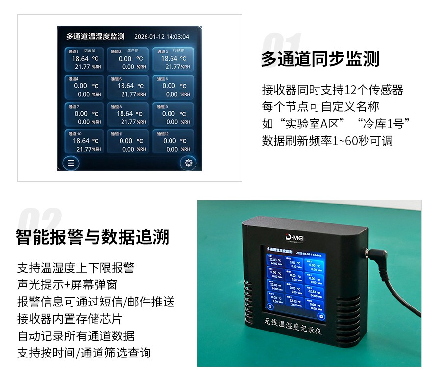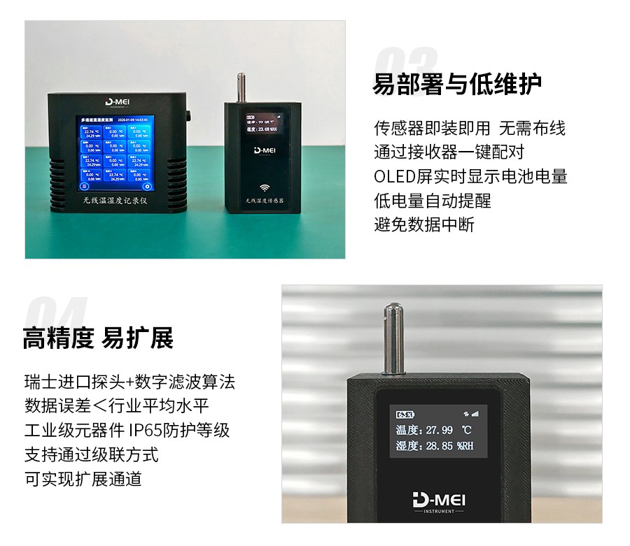 無(wú)線(xiàn)溫濕度采集系統是一款高精度、多通道、易部署的環(huán)境監測解決方案,由無(wú)線(xiàn)溫濕度傳感器和無(wú)線(xiàn)接收器兩部分組成。系統采用瑞士Sensirion原裝溫濕度探頭,結合2.4G無(wú)線(xiàn)通信技術(shù)與工業(yè)級顯示模塊,支持多只傳感器同步監測,適用于實(shí)驗室、倉儲、農業(yè)大棚、機房等多場(chǎng)景的溫濕度實(shí)時(shí)監控與數據追溯。